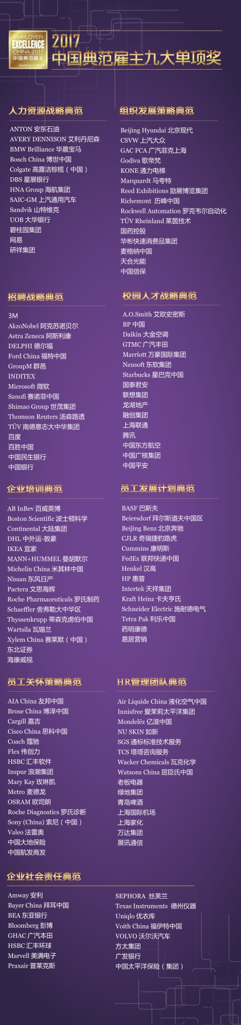 “中国典范雇主”(http://hrawards.51job.com/)是目前国内最大规模的人力资源管理领域的选拔,2008-2017十年间,吸引了1400家领先企业参加,提交案例2100多个,成为中国人力资源管理领域的一大盛事。参选的企业必须提供包括雇员结构、招聘、培训、绩效薪酬和雇主品牌建设等150多个的数据和信息,同时提交具体案例,评选采取邀请参选的方式进行。每年当选的典范雇主不仅显示了中国人力资源管理的最高水平,也显示出人力资源管理的发展风向,提供了人力资源管理前沿思想和实践交锋的一大平台。